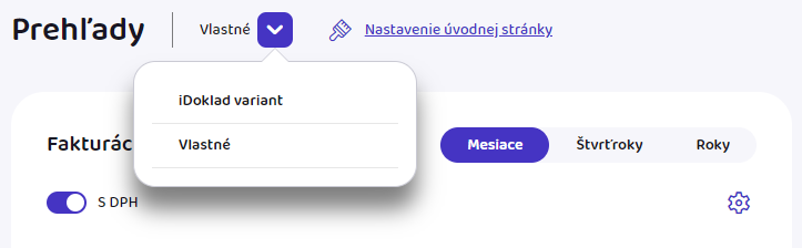 Domovská stránka sa otvára pri spustení aplikácie, v priebehu práce ju kedykoľvek otevoríte v záložke Prehľady alebo kliknutím na logo iDokladu.