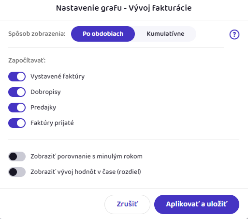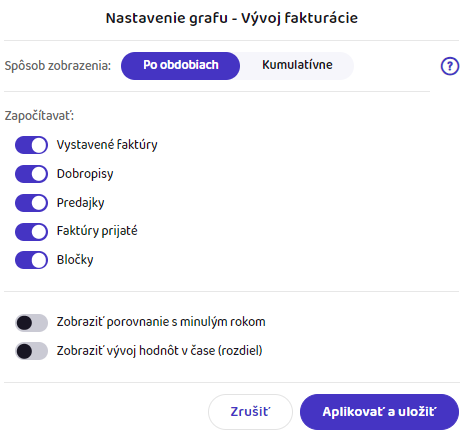 Skopírovať link Skopírované- graf skutočných tržieb si podľa voľby v hornej časti môžete zobraziť pre uplynulé mesiace, kvartály alebo roky. Do zvoleného obdobia spadajú jednotlivé typy dokladov podľa dátumu nasledovne: