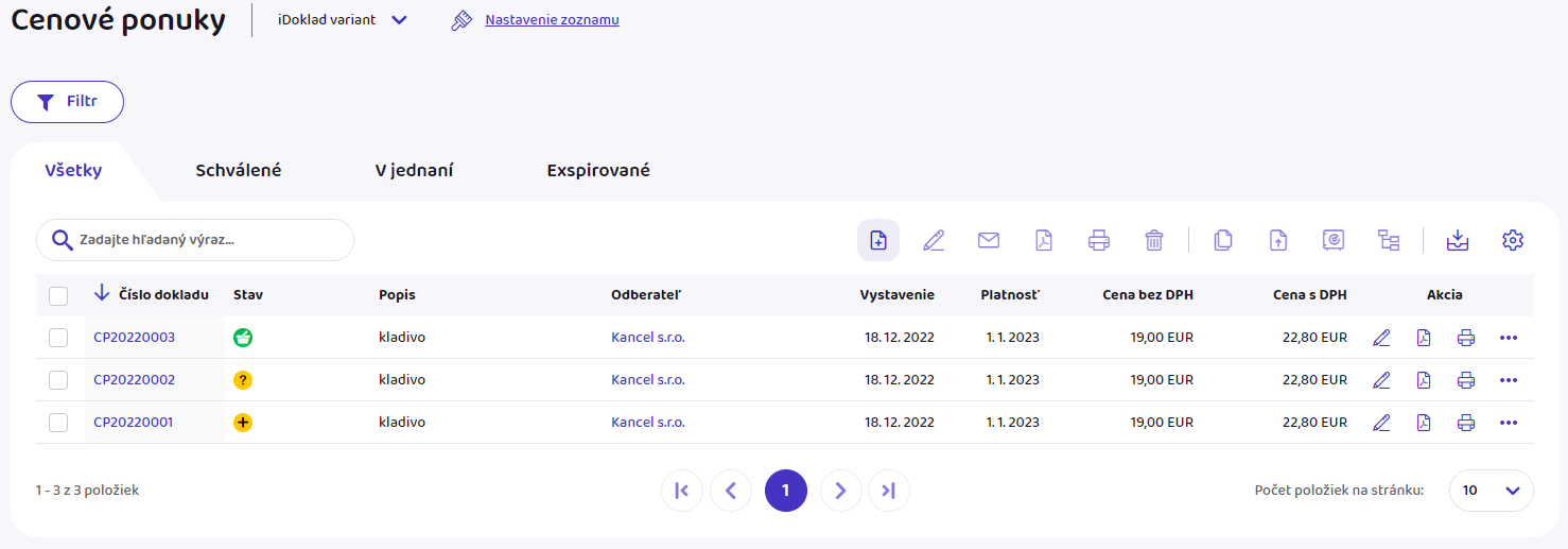 Ak vás zaujímajú ďalšie možnosti práce s cenovými ponukami, napr. ich filtrovanie, nájdete viac informácií v samostatnej kapitole Cenová ponuka.