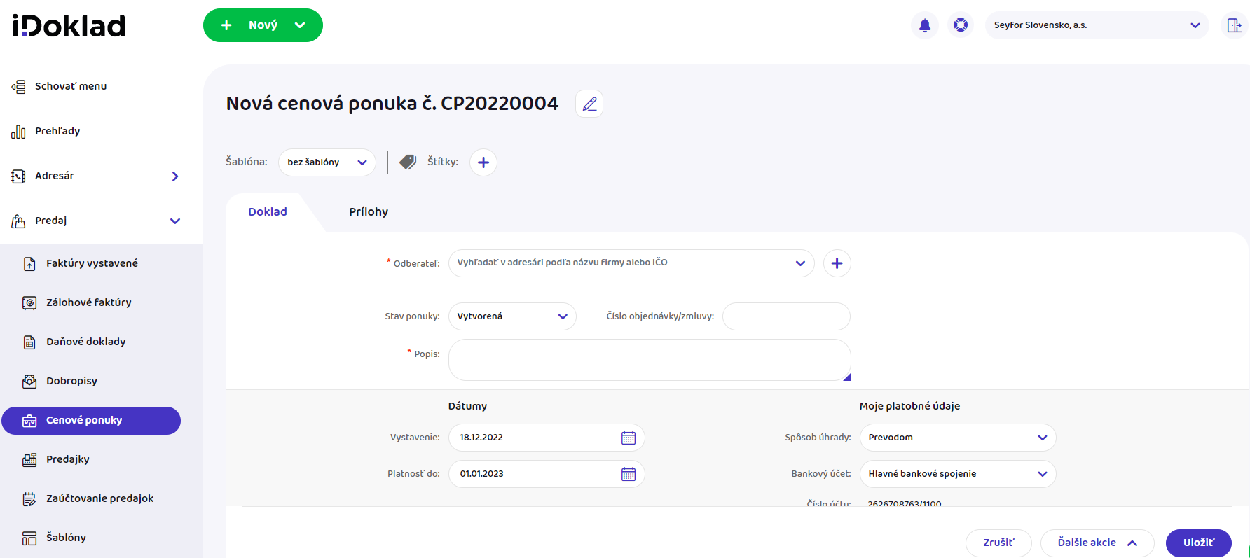 - Šablóna – ak ste si predpripravili šablóny cenových ponúk, môžete niektorú z nich zvoliť. Nové šablóny vytvoríte v časti Predaj → Šablóny.