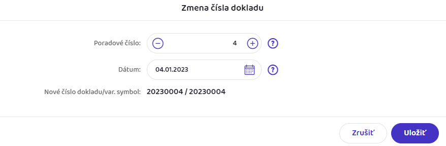 • Zmena čísla dokladu – po kliknutí na ikonu icon za názvom faktúry otvoríte okno, v ktorom upravíte poradové číslo a dátum vystavenia faktúry.