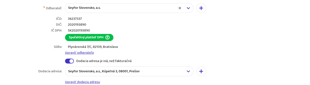 • Dodacia adresa je iná, než fakturačná – zapnutím možnosti zobrazíte pole pre výber dodacej adresy odberateľa, alebo ju pridáte kliknutím na ikonu icon. Pomocou odkazu Upraviť dodaciu adresu editujte údaje uložené v Adresári.