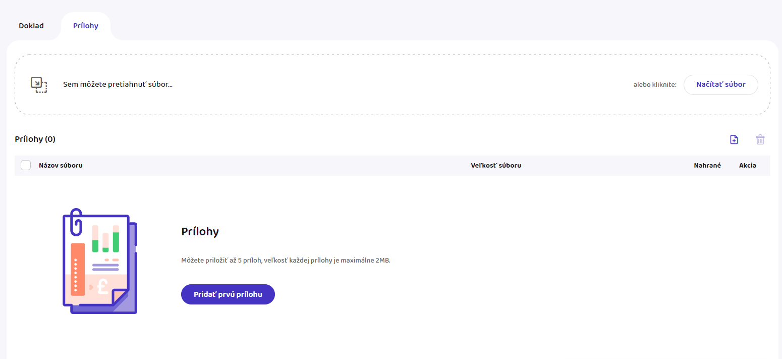V záložke Prílohy v hornej časti karty faktúry môžete pridať prílohu, ktorá sa odošle odberateľovi e-mailom spolu s faktúrou (napr. rozpočet, dodací list, manuál atď.). Pripojíte až 5 príloh vo formáte PNG, JPEG, JPG, PDF, ZIP, RAR, XLSX, DOCX, ODT, ODS alebo TXT. Maximálna veľkosť jedného súboru je 2 MB.