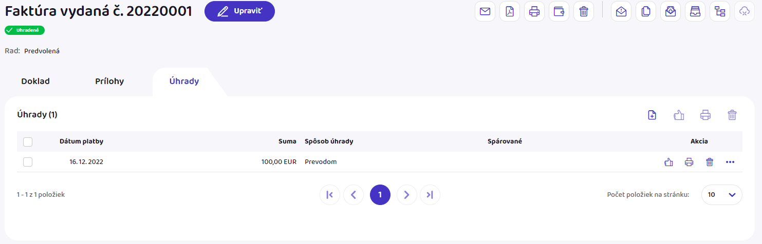Faktúry sú v zozname označené ikonou ukazujúcou stav úhrady, ich prehľad nájdete tu. Po otvorení karty vybranej faktúry vidíte štítok Uhradené/Čiastočne uhradené/Neuhradené/Preplatené.