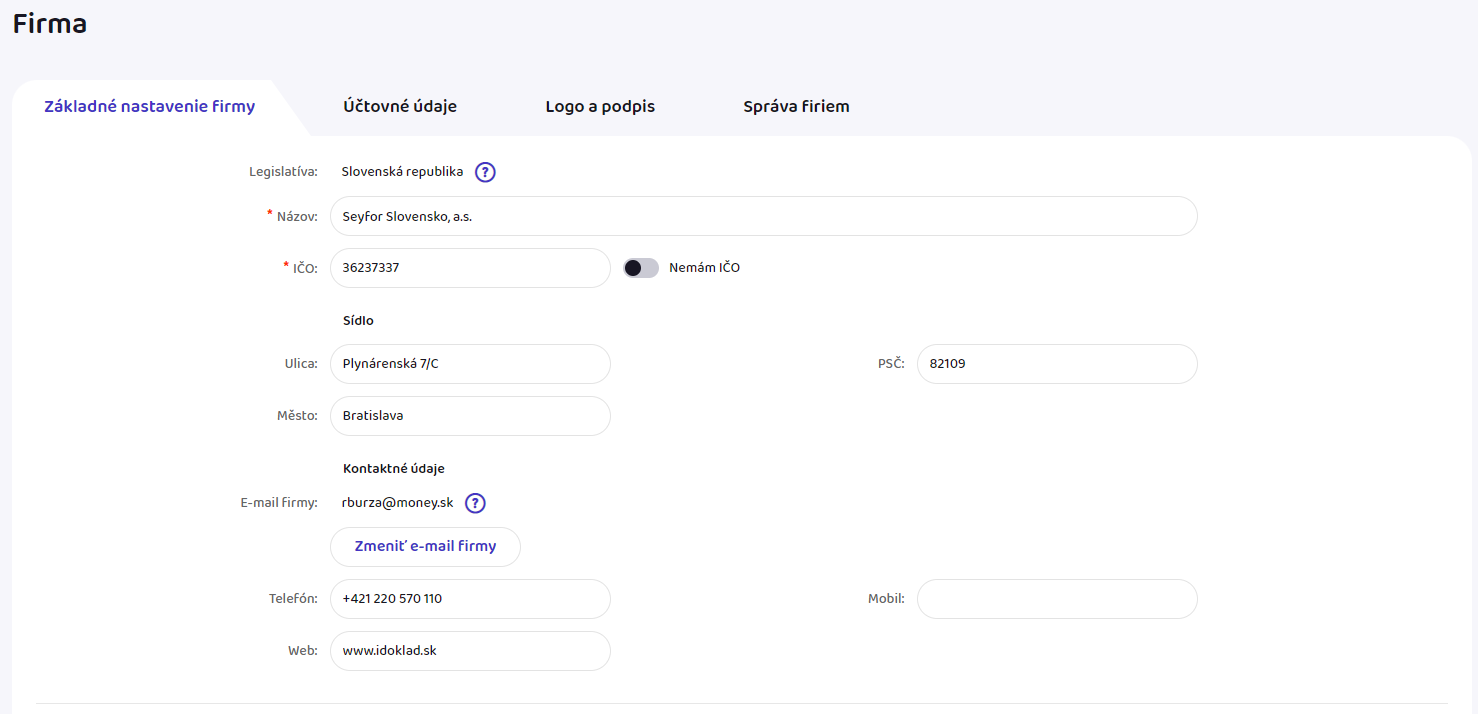 Základné identifikačné a účtovné údaje, podpis aj logo vašej firmy nastavíte v záložke Firma. Údaje sa potom automaticky prepíšu na doklady, ktoré v aplikácii iDoklad vystavíte. Niektoré z nich sú navyše nevyhnutné pre správne zaúčtovanie vystavených faktúr.