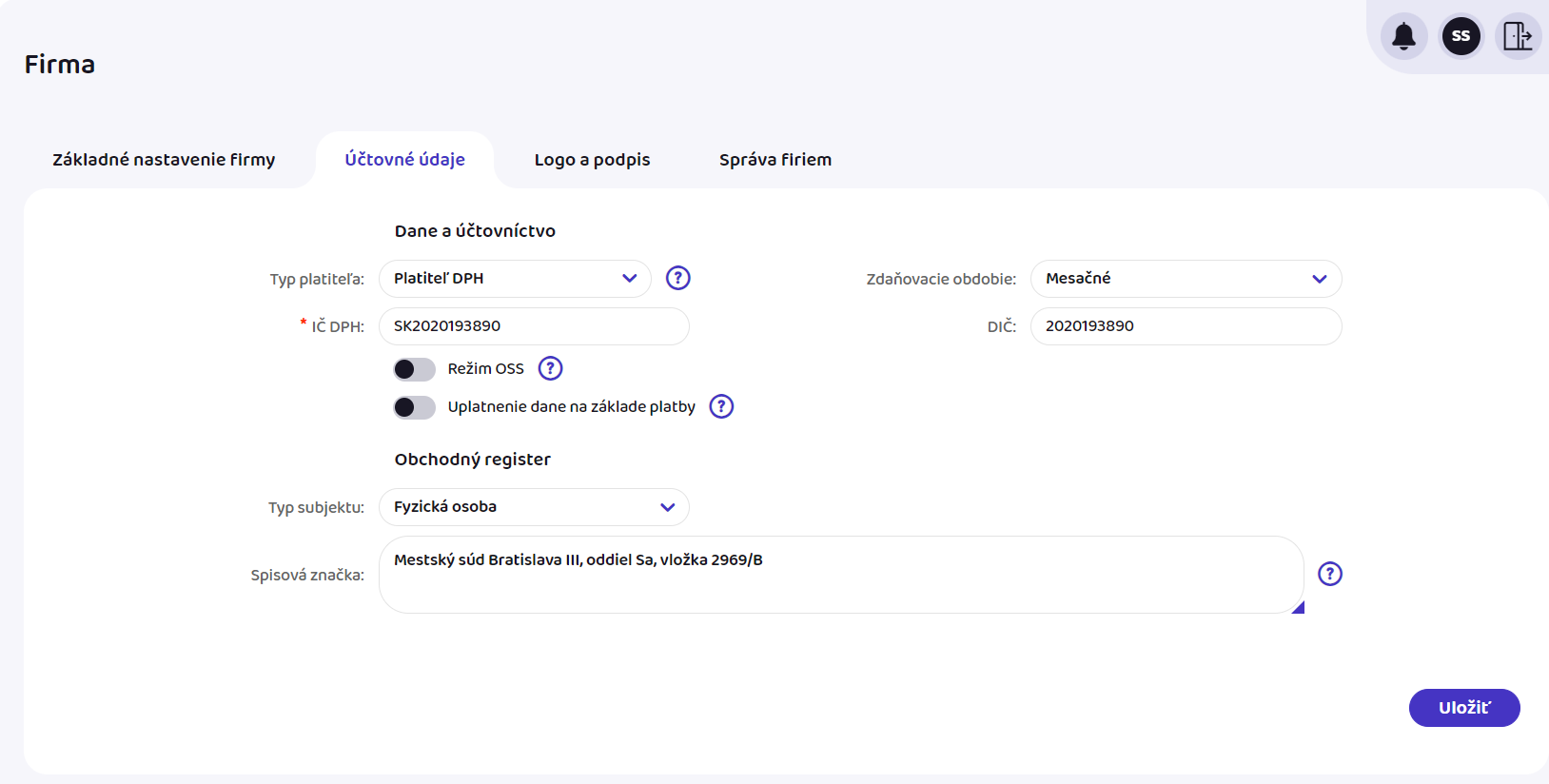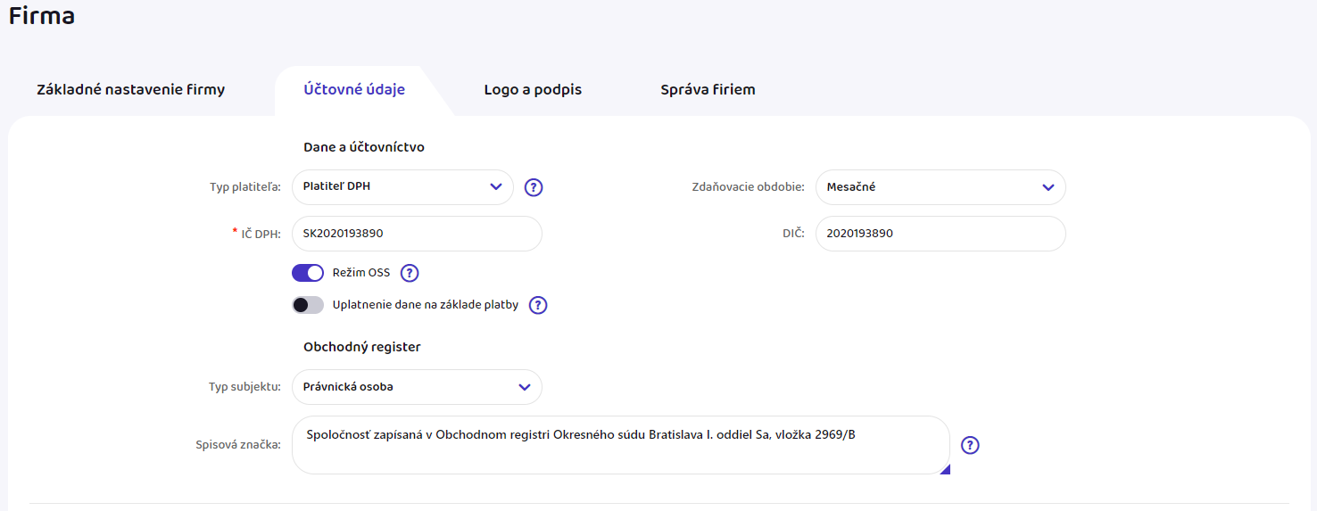 • Režim OSS (One Stop Shop) – zaškrtnutie tohto poľa umožní fakturáciu koncovým zákazníkom (neplatiteľom DPH) v krajinách EÚ podľa ich sadzieb DPH.