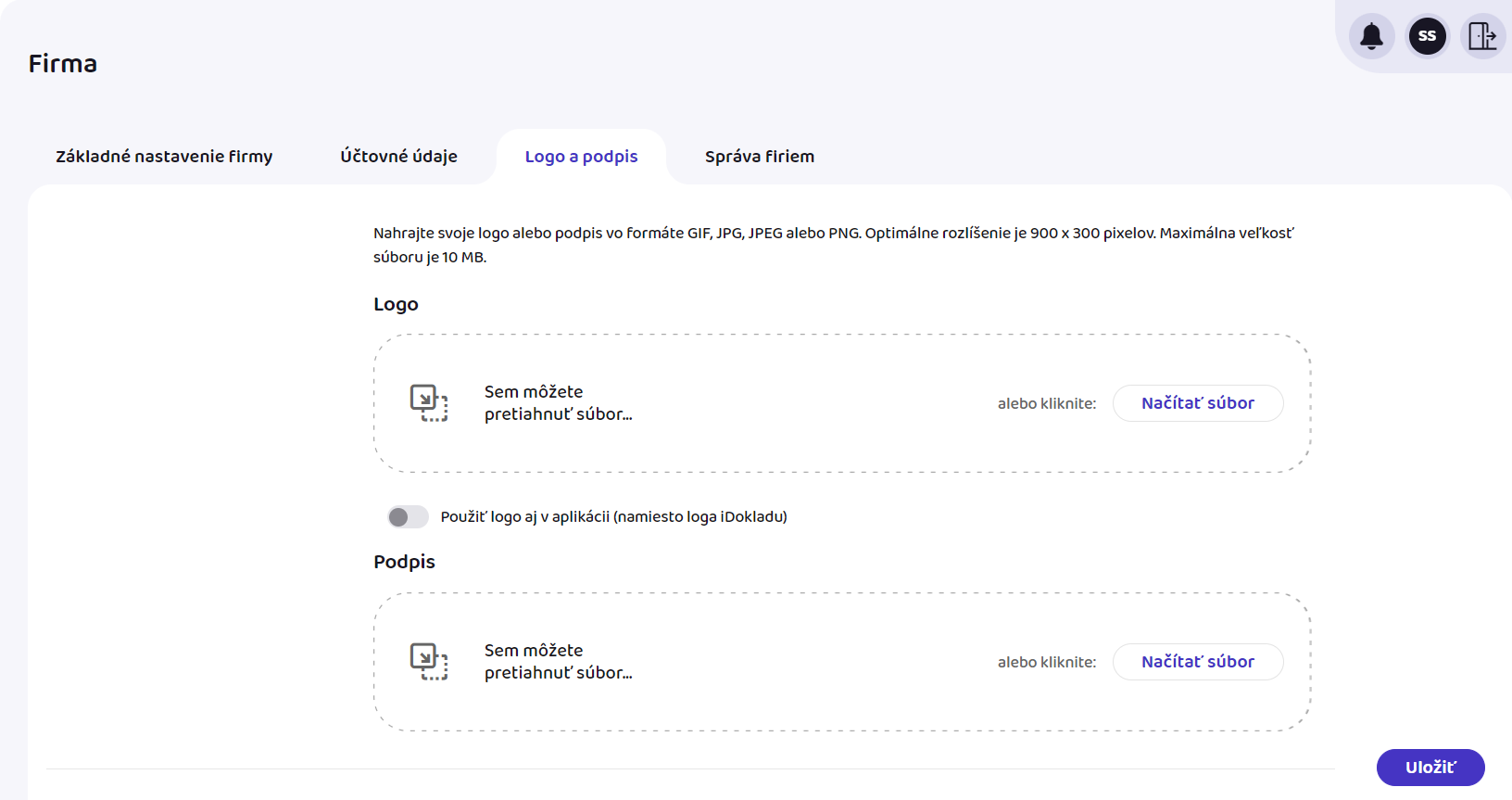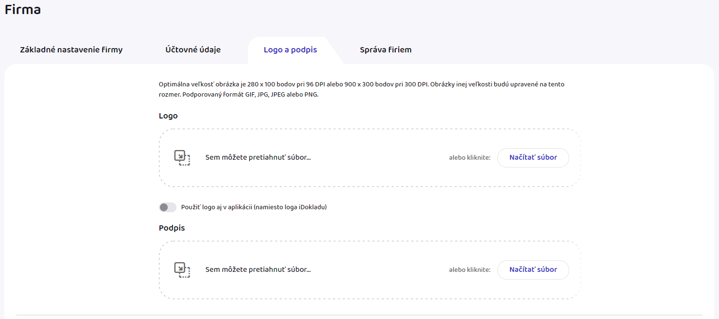 Logo aj podpis nahrajte vo formáte GIF, JPG, JPEG alebo PNG či HTML. Optimálna veľkosť obrázka je 900×300 bodov pri 300 DPI. Ak vložíte väčší obrázok, iDoklad ho automaticky zmenší. Maximálna veľkosť nahraného súboru je 10 MB.
