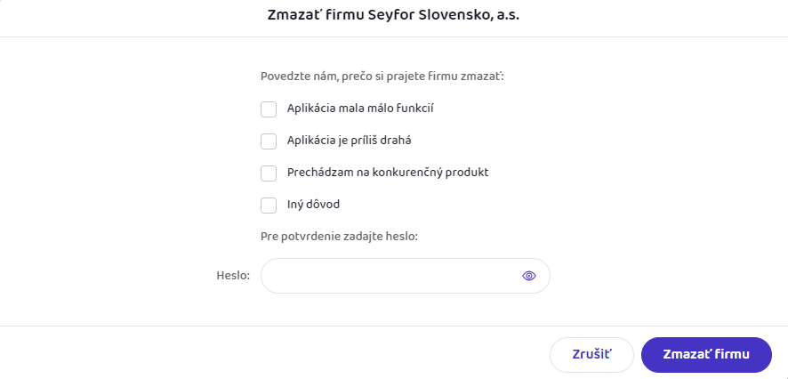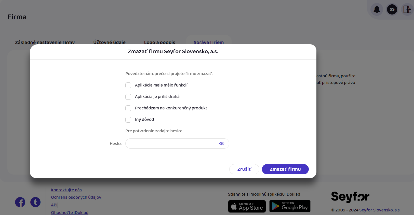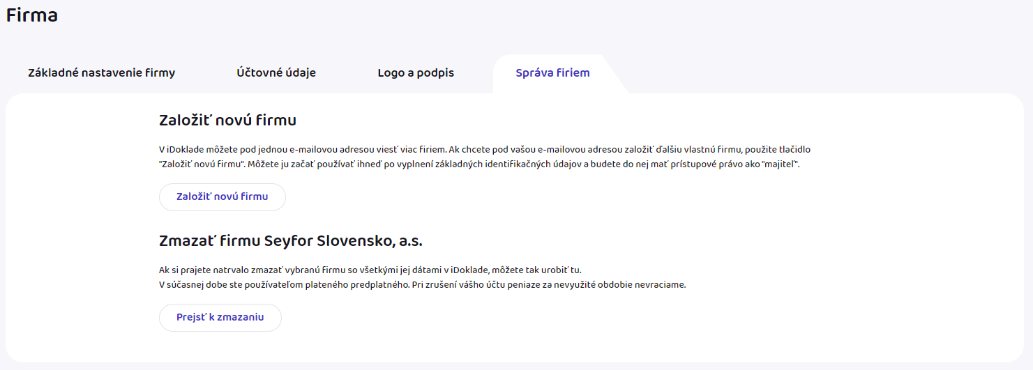 Ak chcete nejakú firmu z iDokladu zmazať aj so všetkými uloženými dátami, ktoré k nej v iDoklade máte, kliknite naPrejsť k zmazaniu. Pri mazaní viacerých firiem musíte každú odstrániť zvlášť.