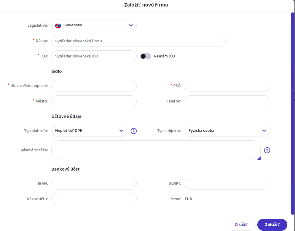 • Legislatíva – legislatívu, ktorou sa firma riadi, je možné zmeniť len pri registrácii účtu.