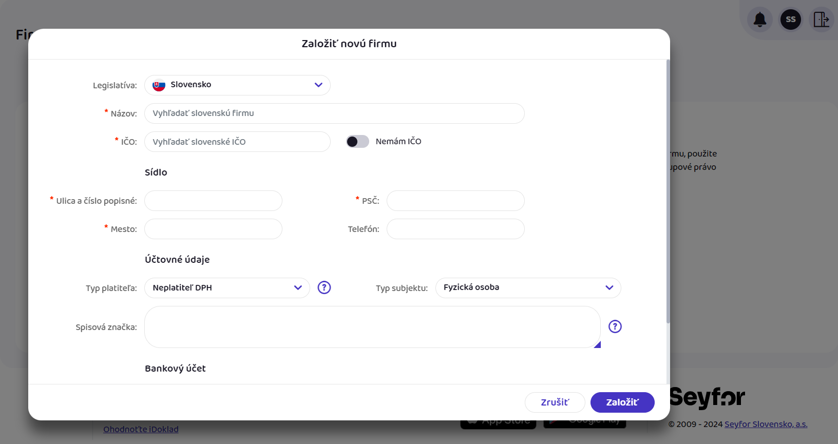 • E-mail – firemný e-mail môže byť odlišný od e-mailu, ktorým sa prihlasujete do iDokladu.