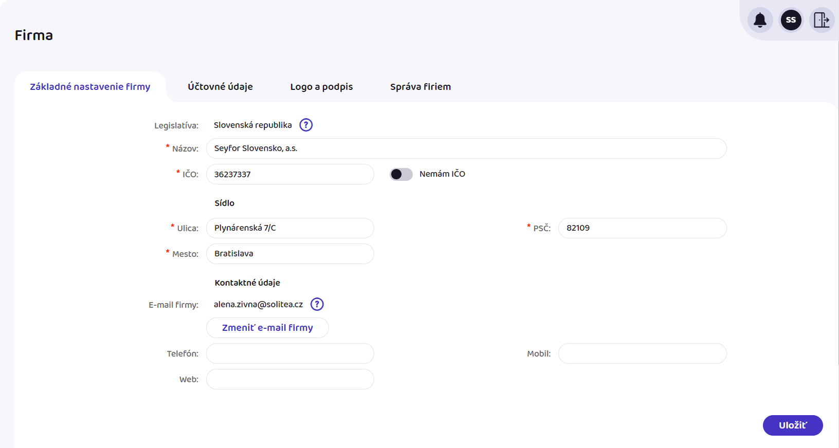Vyhnite sa budúcim úpravám dokladov a vyplňte si údaje o firme ešte predtým, než vystavíte prvú faktúru. Kliknite v ľavom menu na Nastavenie → Firma. Stránka obsahuje 5 záložiek: