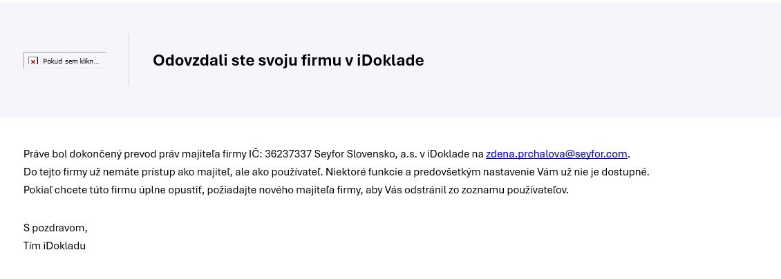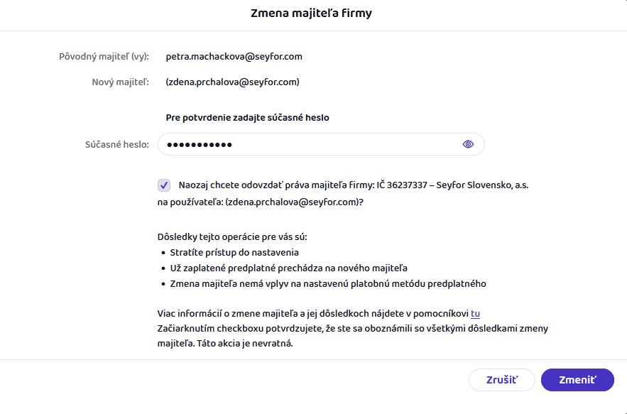 • Pôvodný majiteľ príde o prístup do nastavenia a administrácie firmy. Tieto práva prechádzajú na nového majiteľa.