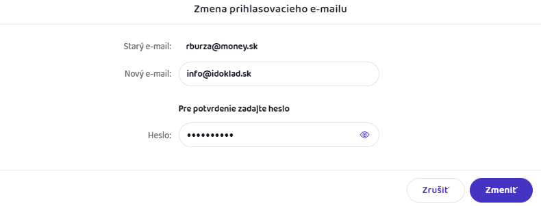 Skopírovať link SkopírovanéPrihlasovací e-mail – e-mailovú adresu, ktorú ste uviedli pri registrácii do iDokladu, upravíte kliknutím na odkaz Zmeniť prihlasovací e-mail. Otvorí sa okno, v ktorom vyplníte nový e-mail a zmenu potvrdíte zadaním hesla, ktoré používate na prihlásenie. Potom kliknete na tlačidloZmeniť. Na zadanú novú e-mailovú adresu príde overovací email a zmena sa vykoná až po jeho potvrdení. Kým ho nepotvrdíte, do iDokladu sa môžete stále prihlásiť pomocou pôvodného e-mailu.