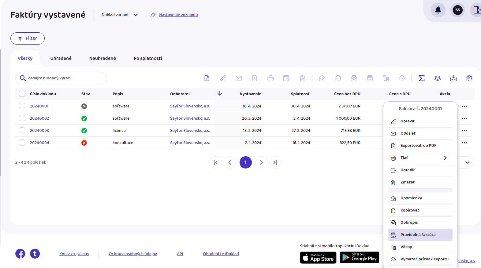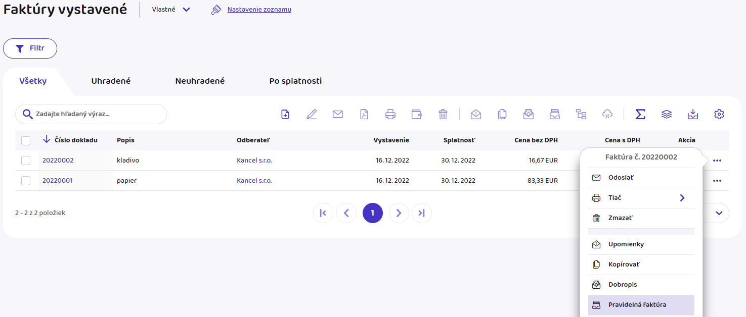 - V zozname vystavených faktúr si vyberte faktúru, z ktorej chcete vytvoriť vzor, a kliknite na tri bodky