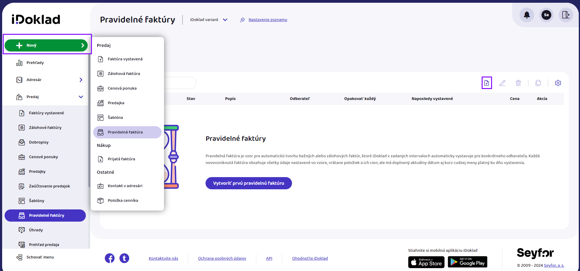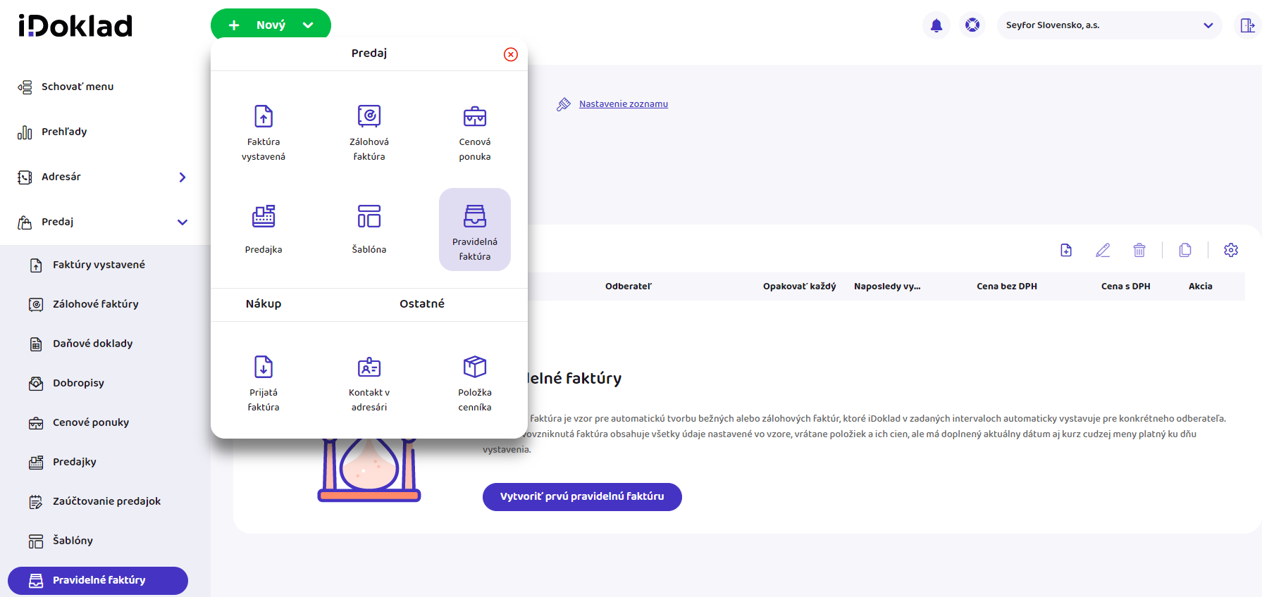 → Pravidelná faktúra. - V ľavom menu kliknite na záložku Predaj → Pravidelné faktúry a nad zoznamom faktúr kliknite na ikonku