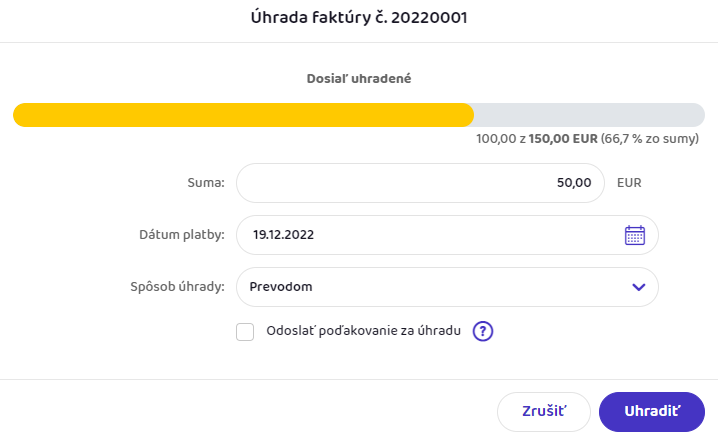 Faktúru môžete aj čiastočne uhradiť po kliknutí tlačidlo Uhradiť icon. Následne nastavíte výšku sumy. Keď sa k úhrade vrátite, po rozkliknutí tlačidla Uhradiť uvidíte, koľko už klient uhradil z celkovej sumy. V spodnej časti môžete zadať dátum platby, sumu úhrady a spôsob úhrady. Pre utuženie vzťahov môžete klientovi poslať aj poďakovanie za platbu. Úhradu uložíte stlačením tlačidlaUhradiť.