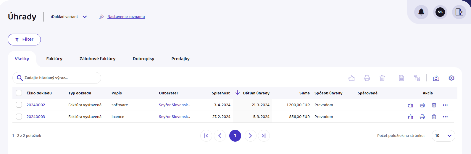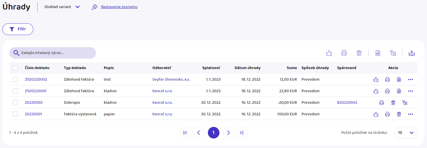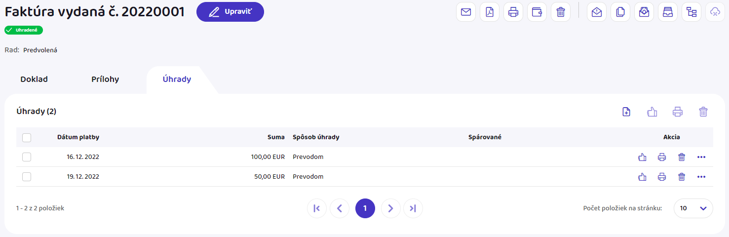 Tam zobrazíte platby všetkých vystavených dokladov, či už ide o plné alebo čiastočné úhrady. Pre každú faktúru môže existovať neobmedzený počet čiastočných úhrad.