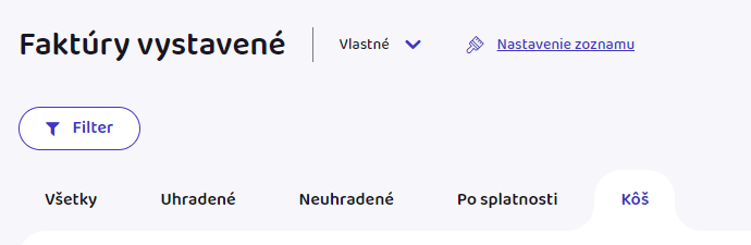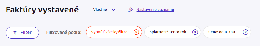 Stačí kliknúť na tlačidlo icon Filter a môžete využiť celý rad údajov, na základe ktorých si svoje faktúry prefiltrujete podľa vašich predstáv. Po zapnutí filtrov sa vám vybrané parametre zobrazia v hornom riadku, nikdy preto nezabudnete, aké práve používate.