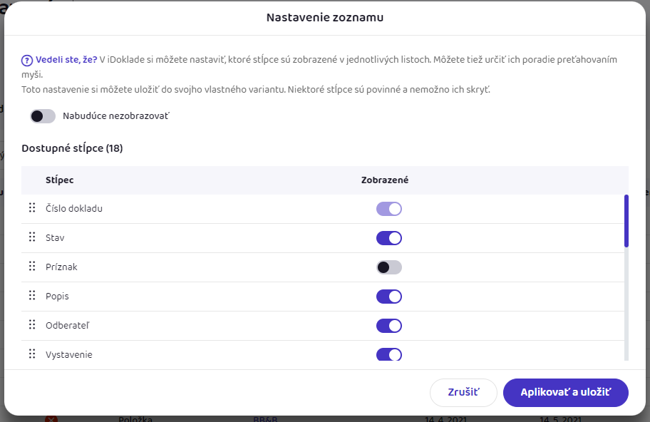 Kliknutím na tlačidlo icon Nastavenie zoznamu môžete zvoliť, aké stĺpce uvidíte v zoznamoch dokladov a taktiež nastaviť ich poradie. iDoklad si dokážete nastaviť podľa vlastných predstáv a vidieť na prvý pohľad dáta, ktoré sú pre vás najdôležitejšie.