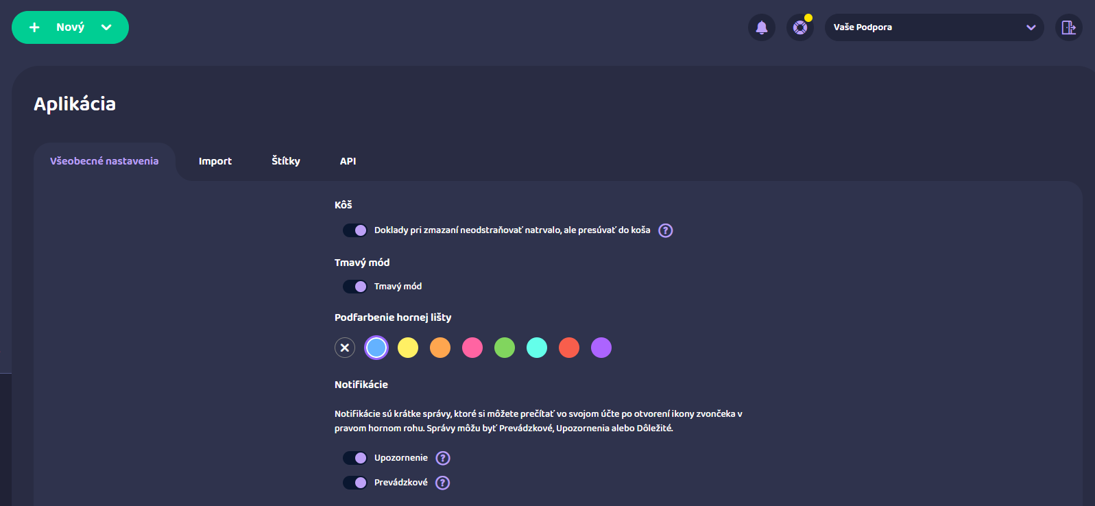 Pomocou Podfarbenia hornej lišty môžete jednoducho oddeliť vizuálne jednotlivé agendy (spoločnosti), ktoré v iDoklade používate.