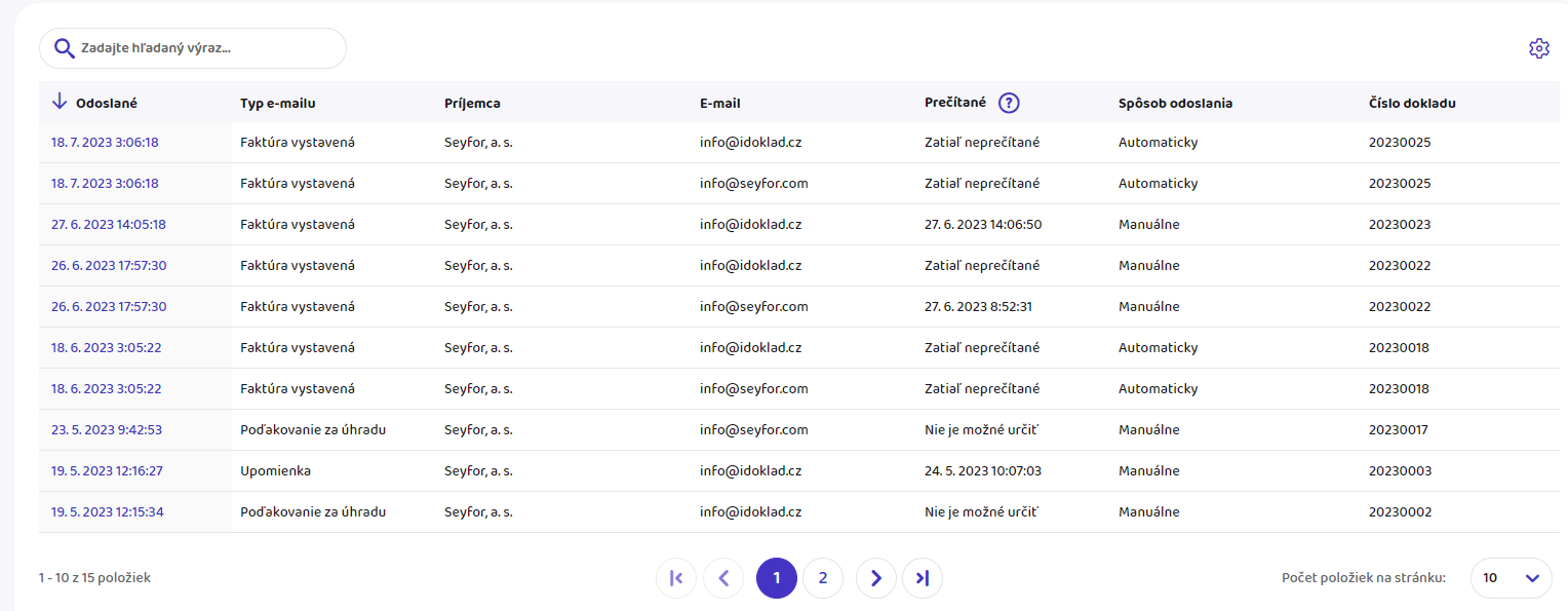 Najväčšou výhodou je, že v tomto prípade sa dokážete pozrieť na to, či váš klient už faktúru otvoril a získať tým cennú informáciu. Tento detail potom nájdete v časti Adresár – História e-mailov v stĺpci Prečítané. Pokiaľ tu vidíte dátum a čas, jedná sa o informáciu, kedy váš zákazník otvoril daný odkaz na vami zaslaný doklad.