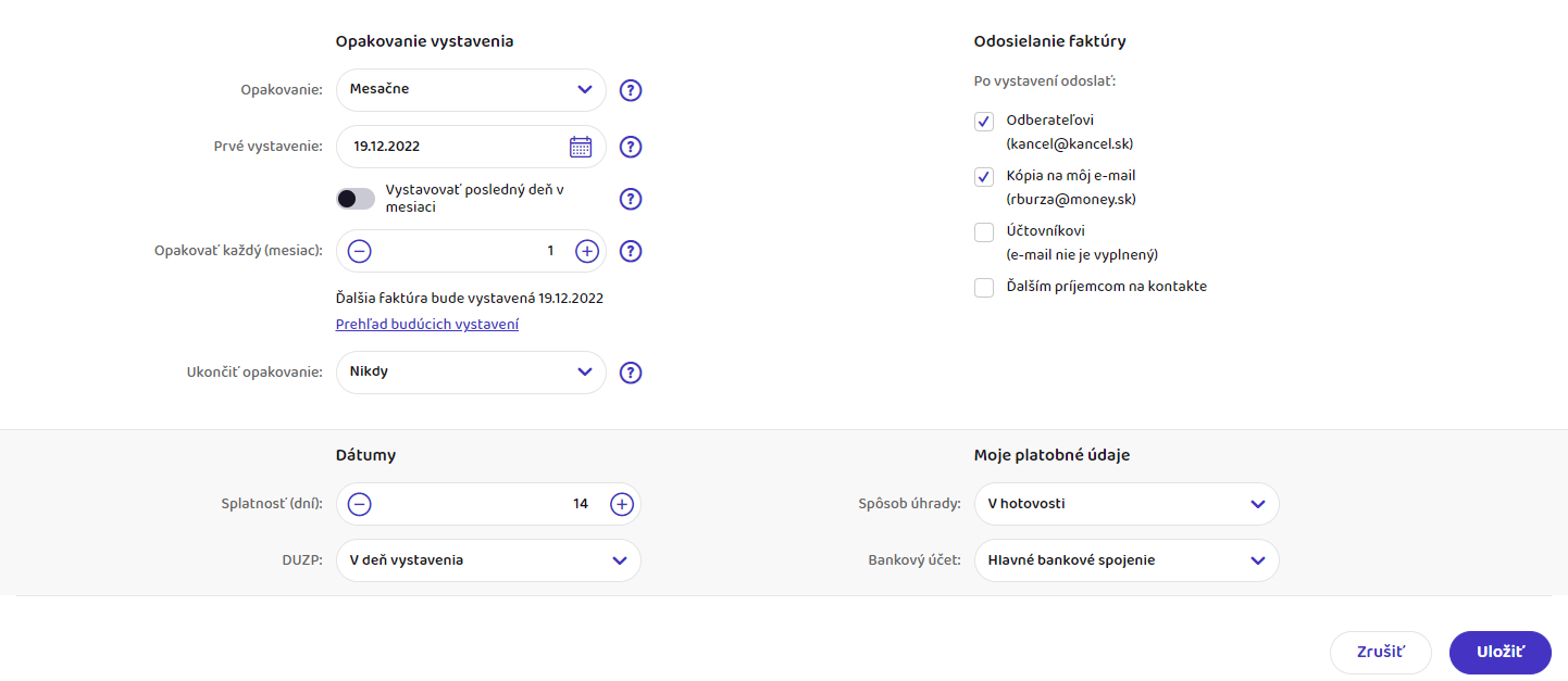 - Opakovať každý (deň/týždeň/mesiac/rok) – podľa zvoleného opakovania zadáte frekvenciu vystavovania faktúry.