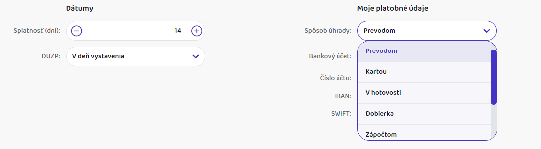 V ďalšej časti nastavte splatnosť a spôsob úhrad:
