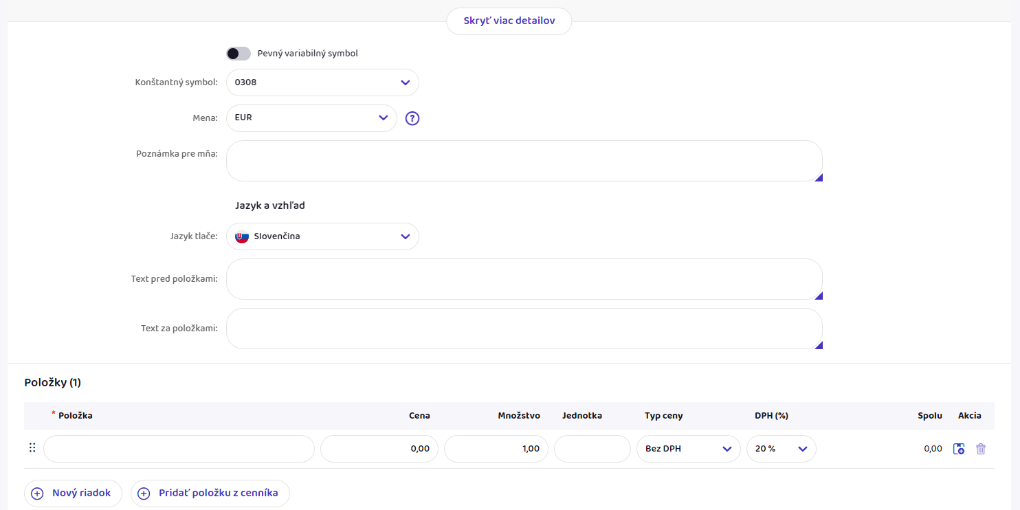 - Ak konštantný symbol nevyplníte (vyberiete prázdne pole na začiatku ponuky), na faktúrach sa symbol neuvedie.